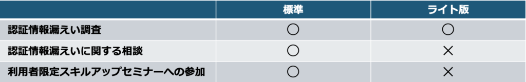 クレデンシャル情報漏えい調査サービスは、標準的な仕様と、認証情報漏えい調査のみに限定した非常に安価なライト版をご用意しています。